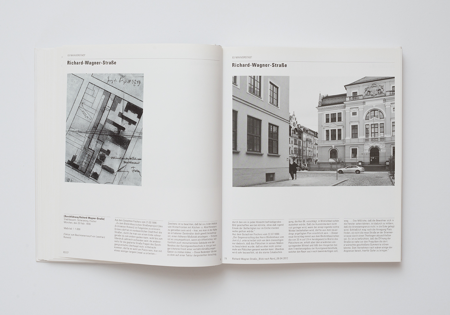 The plans that the architect drew up between 1893 and 1902 laid the foundation for the future urban development of the city of Munich, and in many neighborhoods they continue to have an impact on the characteristic image of the city to this day. From preexisting problems he develops typologies of space that in their structural alignment influence the overall fabric of Munich. The principles of urban design develop site-specific form. The sequence of different spaces is enlivening and at the same time enables overall orientation in the city. When moving through Munich, this continuum visibly comes into its own. The photographic documentation of the building alignment plans thus requires the extensive study of individual plans and a comparative spatial investigation in situ.