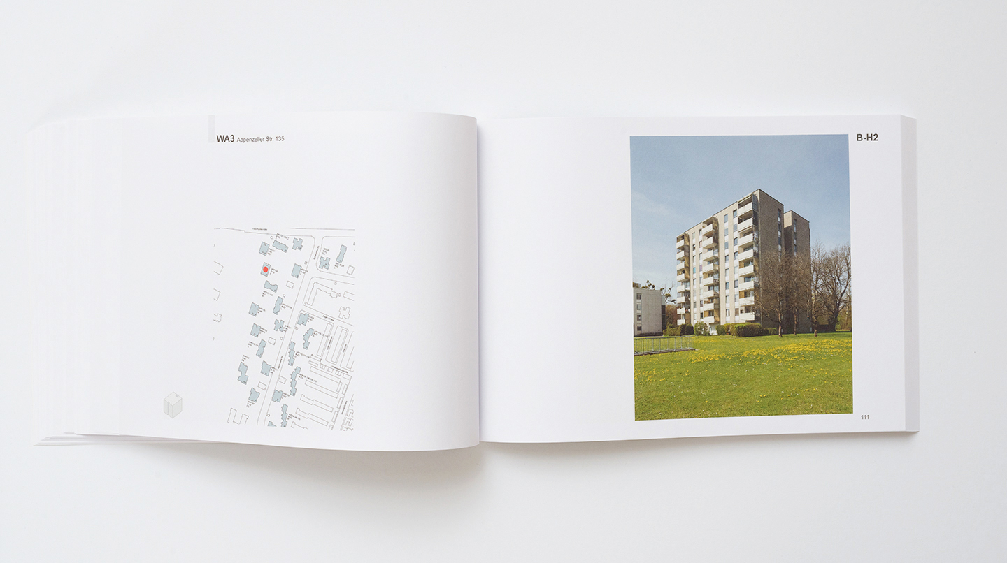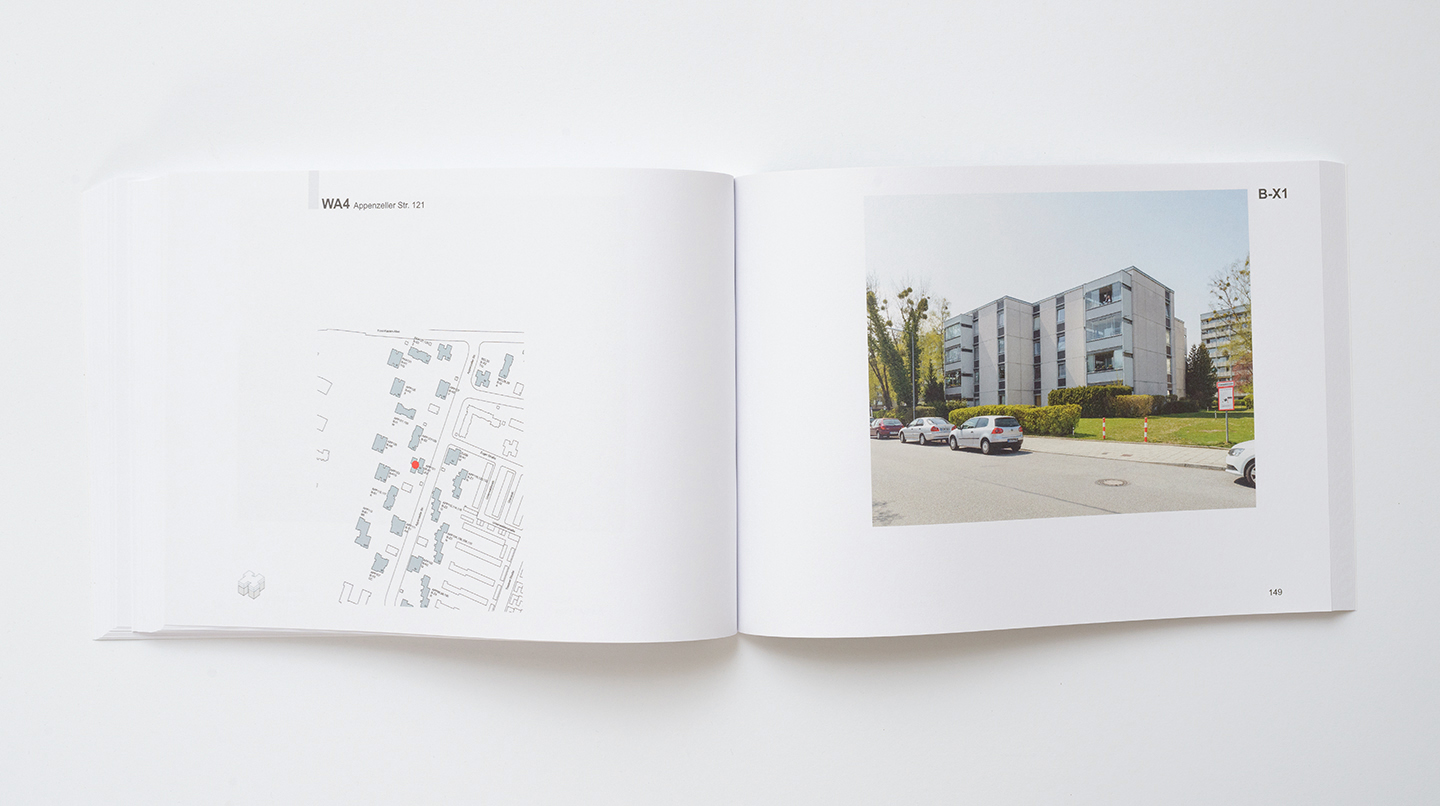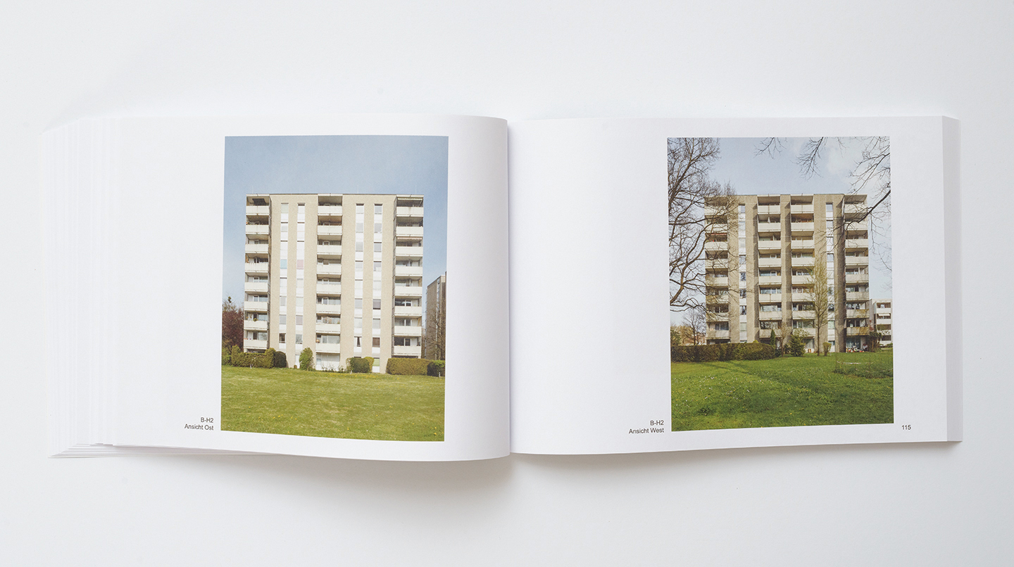 The black-and-white photographs are a comparative examination of different urban spaces designed by one architect in a city. They focus on the material constitution of urban spaces from the vantage point of someone walking by in bright daylight. The gaze is directed upward. The eaves of the buildings delineate the shape of public spaces. “Im Raume lesen wir die Zeit”—In space we read time.